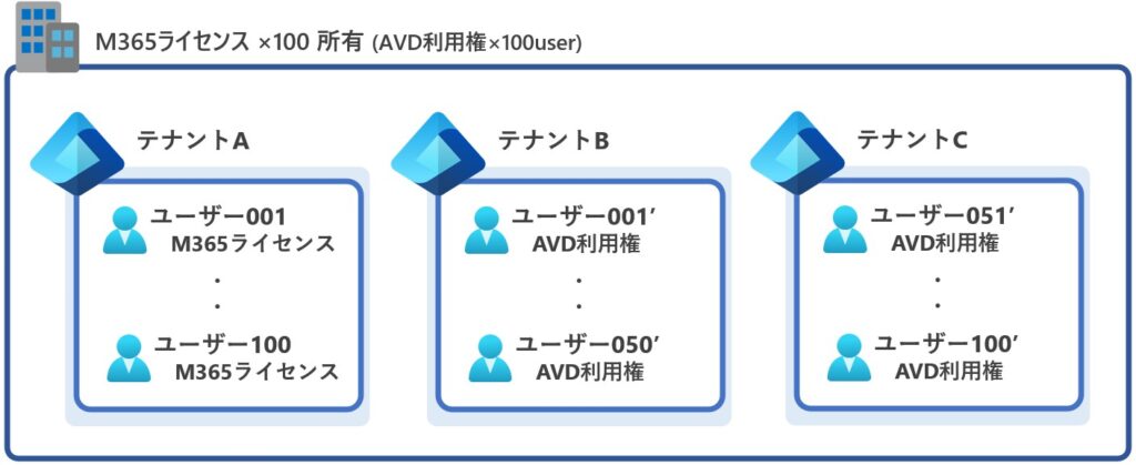 必要なライセンスを紐つけていないEntraテナント/ユーザーアカウント以外でもAVDを利用できます。イメージとして、AVDに必要なライセンスを購入すると、同数のAVD利用権が付いてくる感じです。AVD利用権は、どのユーザーアカウントでも利用可能です。もちろん、割り当てなども不要です。