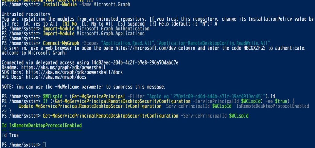Update-MgServicePrincipalRemoteDesktopSecurityConfiguration -ServicePrincipalId $WCLspId -IsRemoteDesktopProtocolEnabled