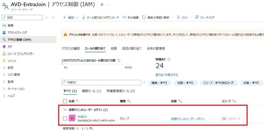 初めに、Entra Join用のリソースグループに対し、外部ID用にRBAC設定を行います。