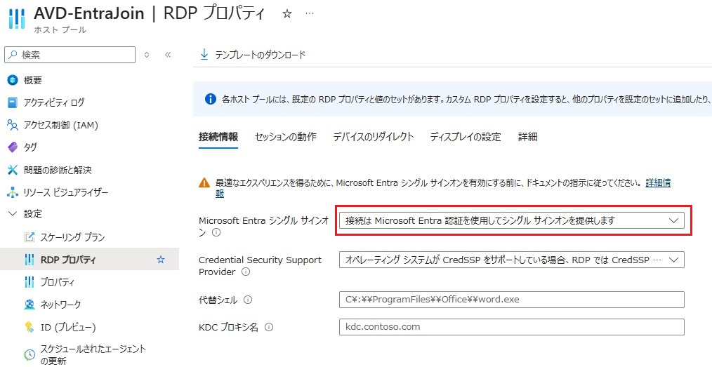 ホストプールの[RDPプロパティ]にて、SSOを有効化します。