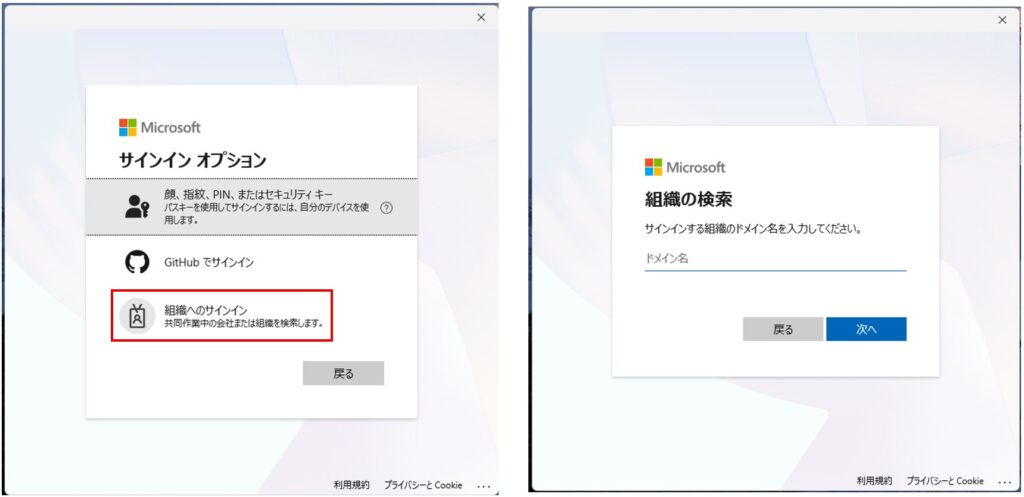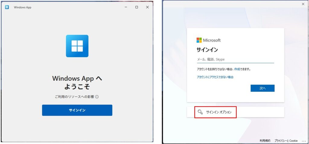 Windows Appを起動ー[サインイン]ー[サインインのオプション]ー[組織へのサインイン]