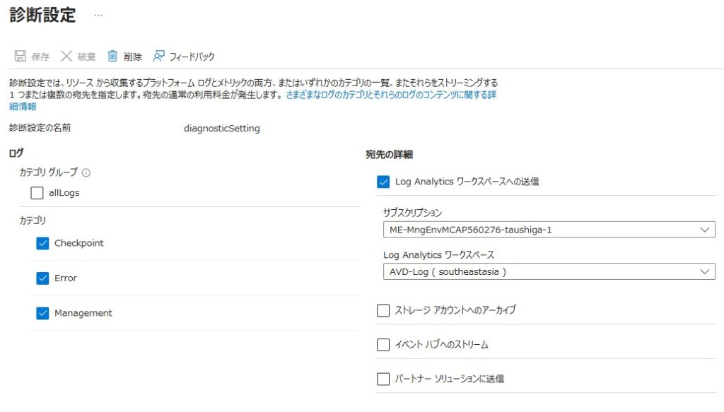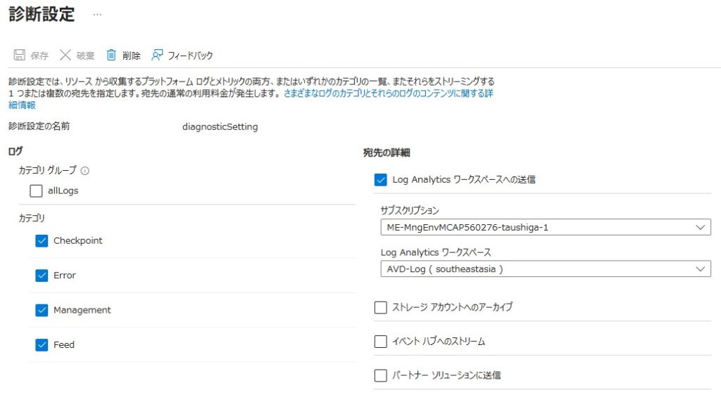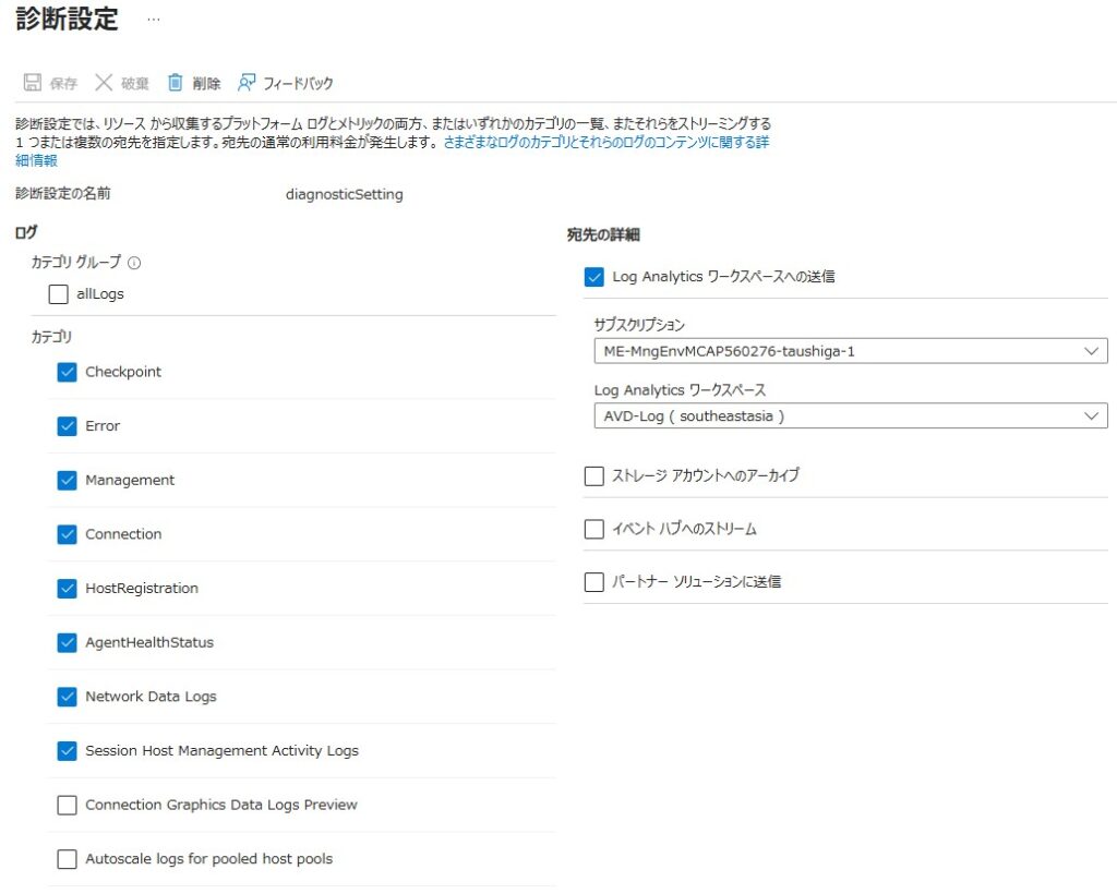 ホストプール、アプリケーショングループ、ワークスペースの診断設定を設定します。